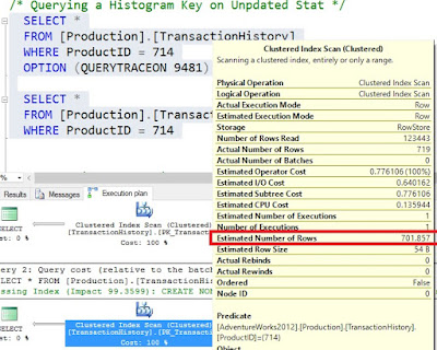 Notice that the histogram contains value "714" as a range hi key and it estimates 645 rows. Estimate on the query plan is slightly higher. As SQL Server knows that approximately 10% of the rows have changed, it makes an adjustment ( 645 + 10% of 645 ) on the both the Cardinality Estimator models.